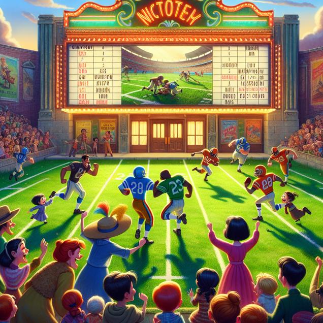 Prompt: An image that looks like it is a scene from A Disney Movie, and depicting this scene: Create a lively scene of a football field filled with green grass, and a joyful team celebrating their victory as the scoreboard displays a high score. In the background, place a majestic-looking theater adorned with colorful Disney movie posters, and families happily waiting in line to enter. The positive energy from the victorious touchdown seems to have touched the moviegoers, who are eagerly heading towards the theater to enjoy Disney movies. The depiction should include only scenes, people, and objects, it should not include text or speech bubbles.