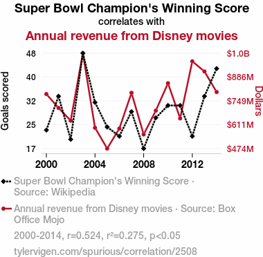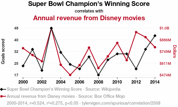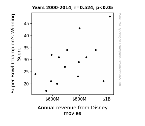 - The spurious research paper: Touchdowns to Ticket Sales: Unveiling the Correlation Between Super Bowl Champion's Winning Score and Disney Movie Revenue