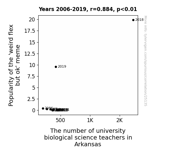 This means 78.2% of the change in the one variable (i.e., The number of university biological science teachers in Arkansas) is predictable based on the change in the other (i.e., Popularity of the 'weird flex but ok' meme) over the 14 years from 2006 through 2019.