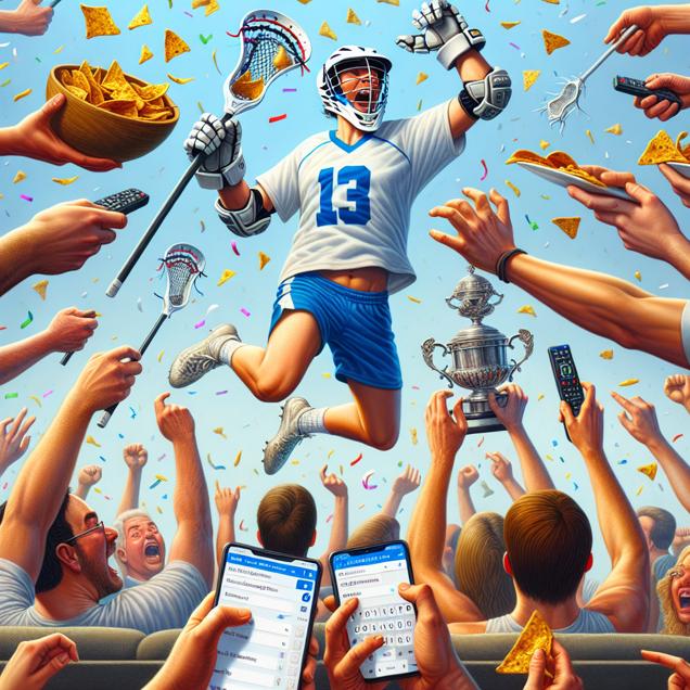 ChatGPT: Generate an image of a hyper-realistic lacrosse player leaping in triumph, surrounded by teammates cheering, with the trophy in hand and confetti raining down. In the background, show individuals frustratedly handling sticky remote controls, with nacho crumbs on their fingers, attempting to operate Google search to look up "Oprah Winfrey."