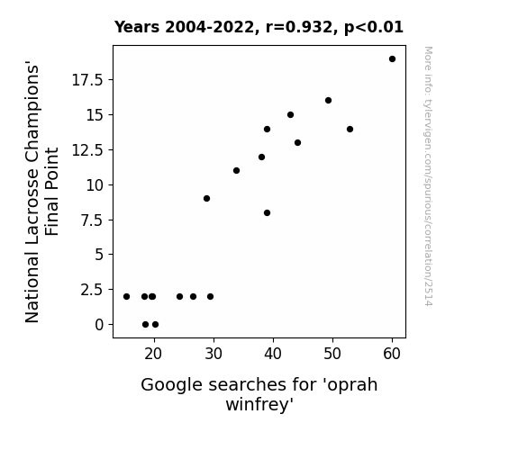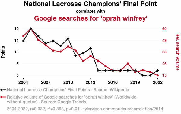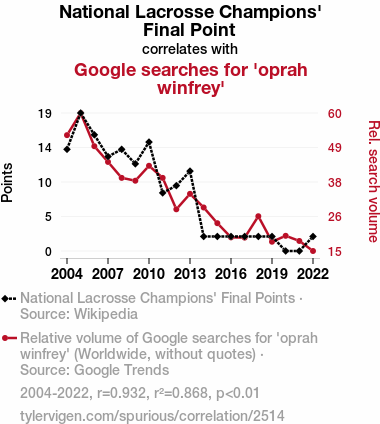 - The spurious research paper: Stick Tricks or TV Flicks: Exploring the Correlation Between National Lacrosse Champions' Final Point and Google Searches for 'Oprah Winfrey'