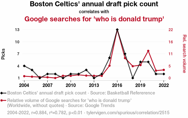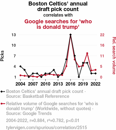 A linear line chart with years as the X-axis and two variables on the Y-axis. The first variable is Boston Celtics' annual draft pick count and the second variable is Google searches for 'who is donald trump'.  The chart goes from 2004 to 2022, and the two variables track closely in value over that time. Small Image