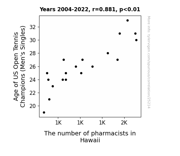 This means 77.6% of the change in the one variable (i.e., The number of pharmacists in Hawaii) is predictable based on the change in the other (i.e., Age of US Open Tennis Champions (Men's Singles)) over the 19 years from 2004 through 2022.
