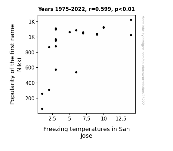 This means 35.9% of the change in the one variable (i.e., Freezing temperatures in San Jose) is predictable based on the change in the other (i.e., Popularity of the first name Nikki) over the 21 years from 1975 through 2022.