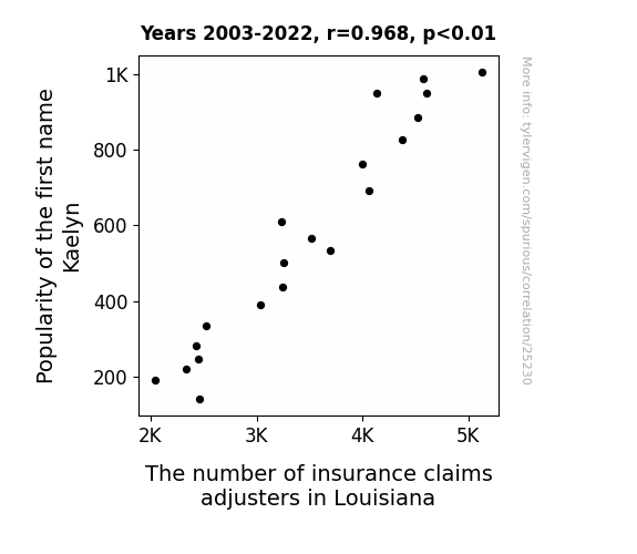 This means 93.7% of the change in the one variable (i.e., The number of insurance claims adjusters in Louisiana) is predictable based on the change in the other (i.e., Popularity of the first name Kaelyn) over the 20 years from 2003 through 2022.