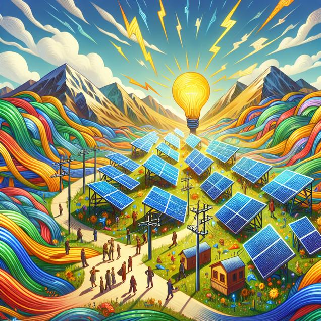 ChatGPT: Generate an image of a whimsical, cutesy art illustration of a futuristic Kazakhstan landscape. The scene should feature vibrant solar panels arranged in neat rows, capturing the essence of renewable energy in the bright sunlight. As the solar panels generate a surge of renewable energy, the illustration should convey an overwhelming sensation, representing a metaphorical power surge. Include disoriented and lightheaded individuals searching for answers amidst the electrifying development, symbolized by an array of swirling patterns and dynamic movement.