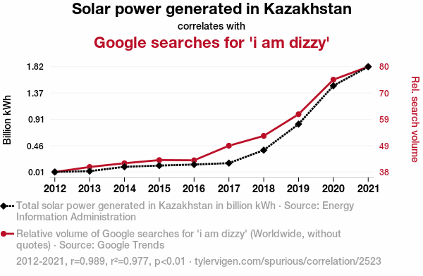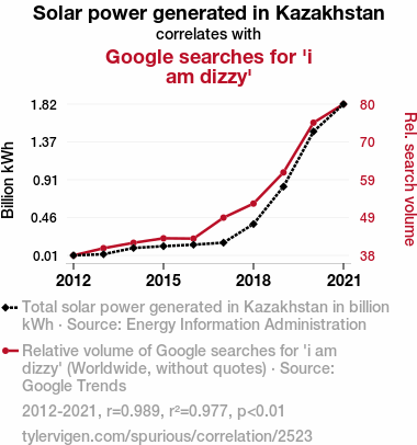 - The spurious research paper: Solar Flare-Ups: A Bright Outlook on the Relationship Between Solar Power Generation in Kazakhstan and Online Queries for 'I Am Dizzy'