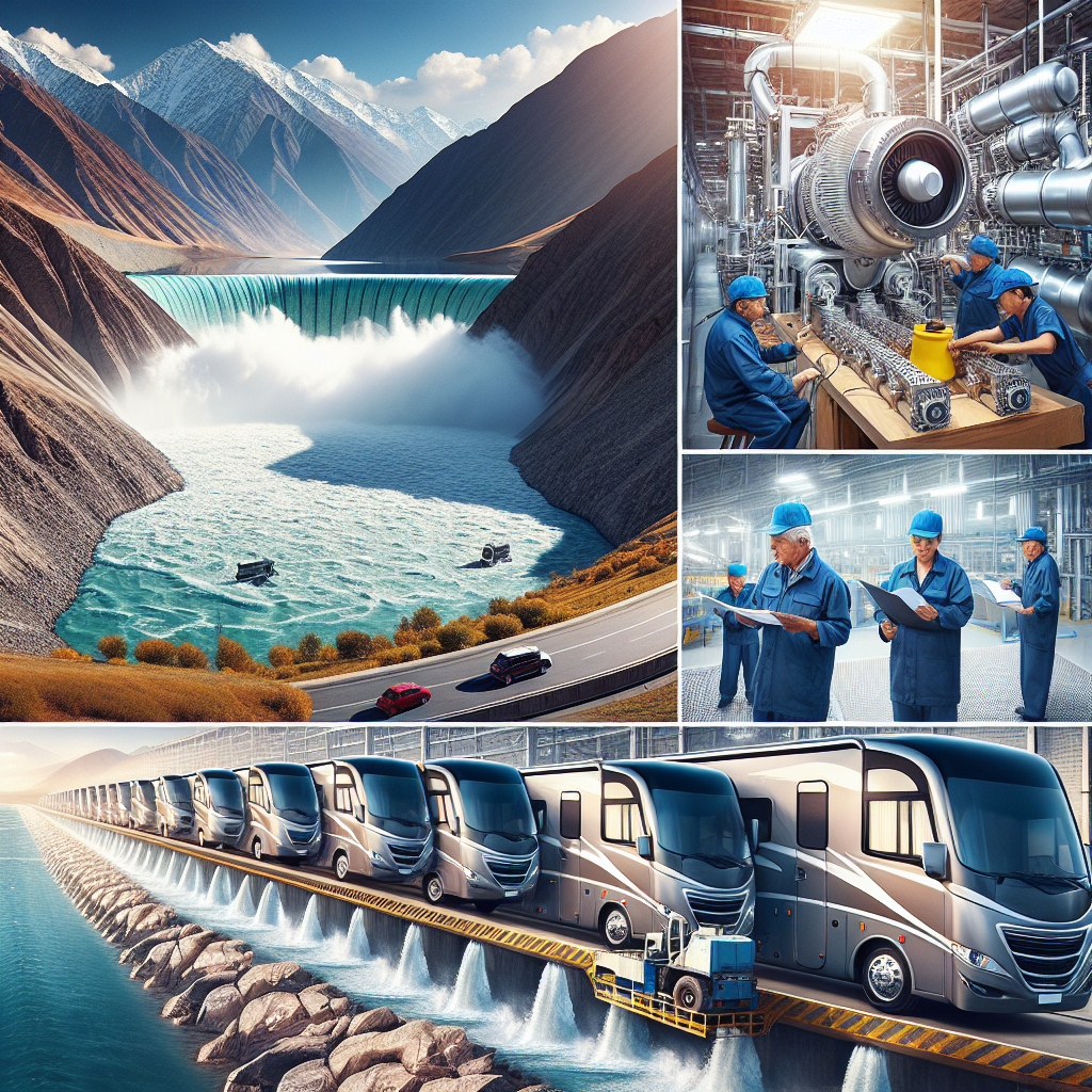 User prompt: Please describe a visual scene that prominently depicts both Hydopower energy generated in Tajikistan and Automotive recalls issued by Keystone RV Company, in the following situation: The surge in hydroelectric power in Tajikistan sent a shockwave through the global energy market, sparking a chain reaction that revved up the production of RVs at Keystone. But it seems like they may have short-circuited somewhere along the line, leading to a whole caravan of faulty vehicles hitting the road. This power play inadvertently drove the RVs into a breakdown lane, leaving the company feeling quite amped up about the whole situation. It's like they tried to harness the power of Tajikistan's energy boom, but ended up getting a jolt of reality instead. This shocking turn of events has really put the company in a current predicament, and they're now scrambling to find a positive outlet for all the negative feedback. It's a cautionary tale of how a surge in one part of the world can lead to a total power outage in another, leaving everyone involved feeling a bit... deflated.. Keep the description simple.