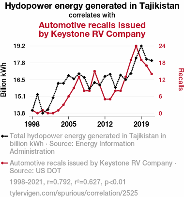 hydropower energy, Tajikistan, automotive recalls, Keystone RV Company, correlation coefficient, energy generation, Energy Information Administration, US Department of Transportation, electricity generation, statistical significance, automotive industry, global energy production, interconnected nature, unexpected connections, truth in statistics