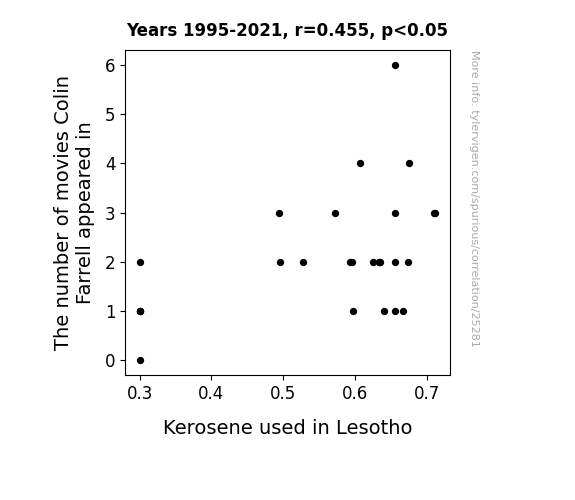 This means 20.7% of the change in the one variable (i.e., Kerosene used in Lesotho) is predictable based on the change in the other (i.e., The number of movies Colin Farrell appeared in) over the 27 years from 1995 through 2021.
