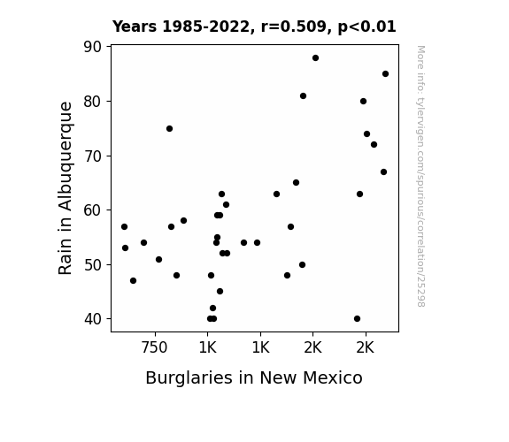 This means 25.9% of the change in the one variable (i.e., Burglaries in New Mexico) is predictable based on the change in the other (i.e., Rain in Albuquerque) over the 38 years from 1985 through 2022.