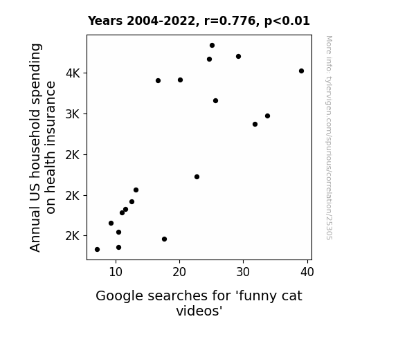 This means 60.1% of the change in the one variable (i.e., Google searches for 'funny cat videos') is predictable based on the change in the other (i.e., Annual US household spending on health insurance) over the 19 years from 2004 through 2022.
