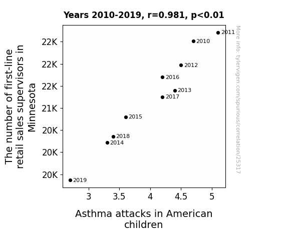 This means 96.3% of the change in the one variable (i.e., Asthma attacks in American children) is predictable based on the change in the other (i.e., The number of first-line retail sales supervisors in Minnesota) over the 10 years from 2010 through 2019.