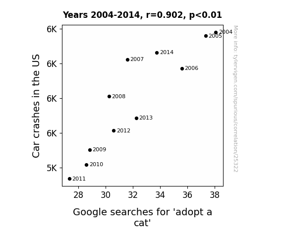 This means 81.3% of the change in the one variable (i.e., Google searches for 'adopt a cat') is predictable based on the change in the other (i.e., Car crashes in the US) over the 11 years from 2004 through 2014.