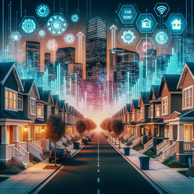 User prompt: Please respond with an image generation prompt that would be likely to create an interesting visual using DALLE-3, using the following style: [ High-tech ] and depicting this scene: In the visual scene, we see a suburban street lined with cozy rented dwellings. A newly renovated "For Rent" sign catches the eye, indicating an increase in household spending on rented homes. As the sun sets, the scene shifts to a bustling financial district where the stock market is depicted. The stock ticker for Cognizant Technology Solutions' (CTSH) rises steadily, reflecting the company's strong performance due to increased demand for its services. The correlation between the two variables becomes evident in this scene, as the rising household spending on rents coincides with the upward trajectory of CTSH's stock price. Keep the visual depiction simple. Do not include any words or speech bubbles.