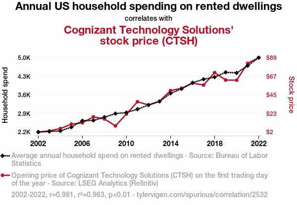 Annual US household spending, rented dwellings, Cognizant Technology Solutions stock price, CTSH, correlation study, relationship, Bureau of Labor Statistics, LSEG Analytics, Refinitiv, correlation coefficient, stock market, rent spending, tech stocks, coincidence, academic discussion