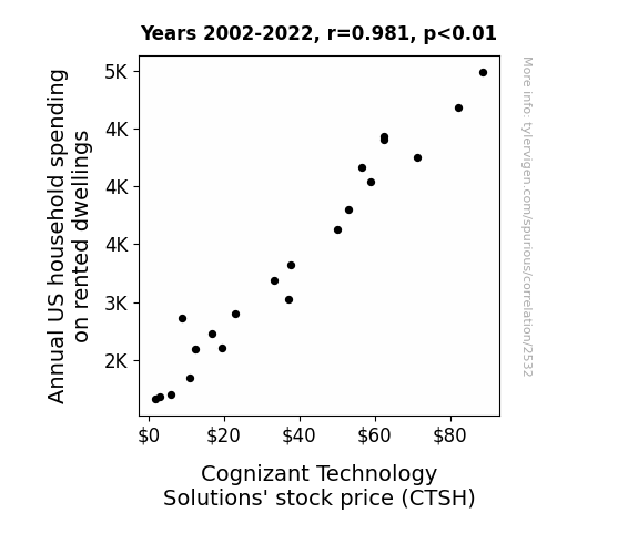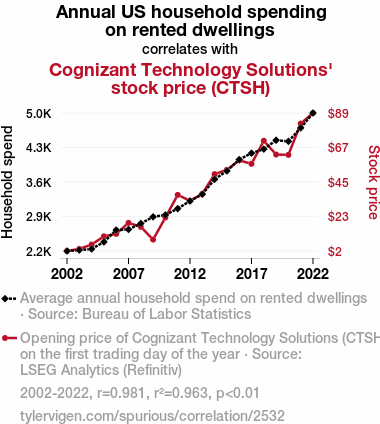 User prompt: Please provide potential search keywords for a paper titled Dwelling Spending Swelling and CTSH Yelling: A Correlation Story Worth Telling with an abstract of This study investigates the potential relationship between Annual US household spending on rented dwellings and Cognizant Technology Solutions' stock price (CTSH) over the period of 2002 to 2022. Leveraging data from the Bureau of Labor Statistics and LSEG Analytics (Refinitiv), our research team uncovered a striking correlation coefficient of 0.9812502 and p < 0.01. Imagine the shock when we realized the correlation was not just a "rent-ly" formed illusion! This finding sparks a witty debate - does rent spending lead to tech stocks ascending, or is it all just a mere coincidence? We aim to delve into this intriguing correlation, adding humor to the otherwise "dry" academic discussion.