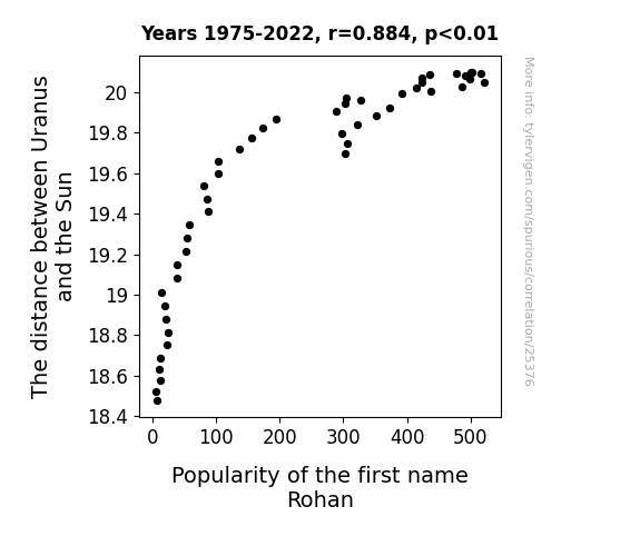 This means 78.2% of the change in the one variable (i.e., Popularity of the first name Rohan) is predictable based on the change in the other (i.e., The distance between Uranus and the Sun) over the 48 years from 1975 through 2022.