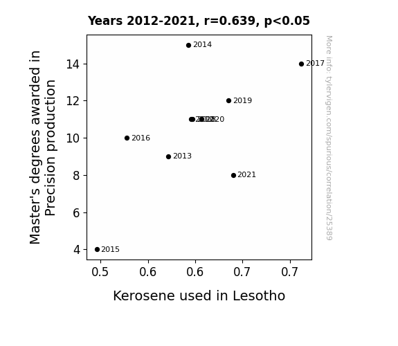 This means 40.8% of the change in the one variable (i.e., Kerosene used in Lesotho) is predictable based on the change in the other (i.e., Master's degrees awarded in Precision production) over the 10 years from 2012 through 2021.