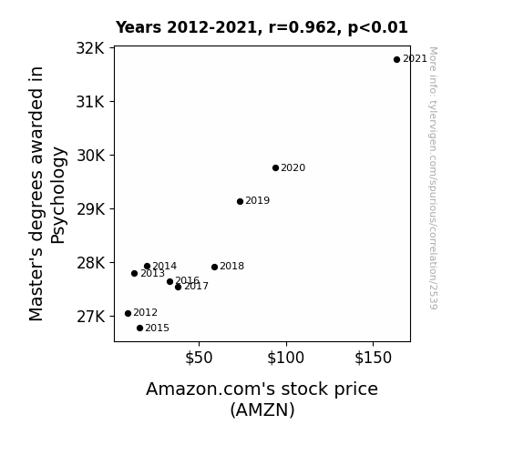 This means 92.5% of the change in the one variable (i.e., Amazon.com's stock price (AMZN)) is predictable based on the change in the other (i.e., Master's degrees awarded in Psychology) over the 10 years from 2012 through 2021.