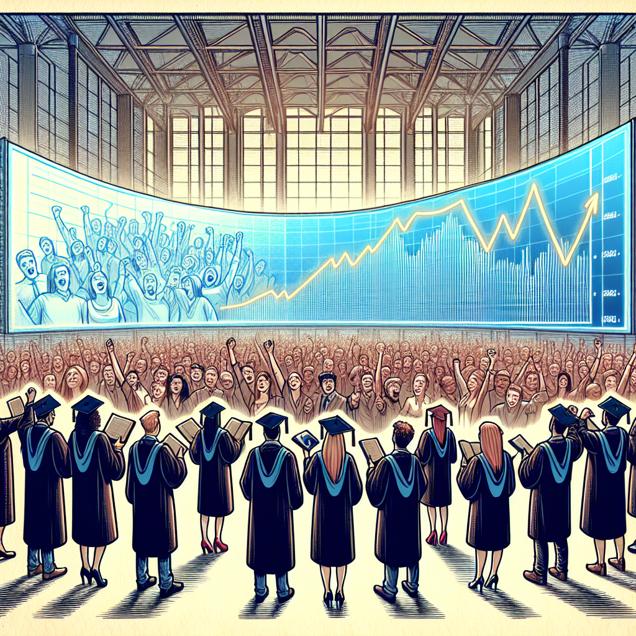 User prompt: Please respond with an image generation prompt that would be likely to create an interesting visual using DALLE-3, using the following style: [ Data cyber art ] and depicting this scene: In a cozy university hall, a group of students proudly hold up their Master's degrees in Psychology, their understanding of human behavior gleaming in their eyes. In the background, a digital screen displays Amazon.com's stock price soaring to new heights, reflecting the ripple effect of their knowledge on consumer choices and boosting sales for the e-commerce giant. Keep the visual depiction simple. Do not include any words or speech bubbles.