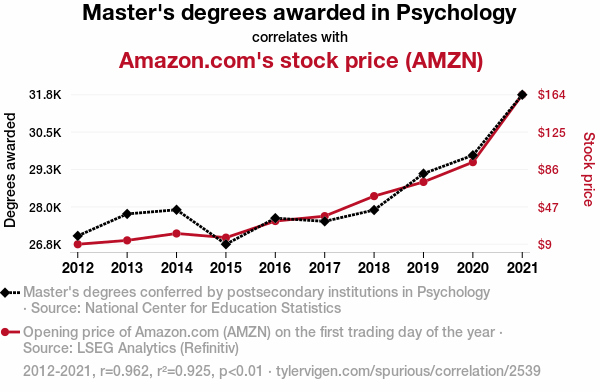 This means 92.5% of the change in the one variable (i.e., Amazon.com's stock price (AMZN)) is predictable based on the change in the other (i.e., Master's degrees awarded in Psychology) over the 10 years from 2012 through 2021.