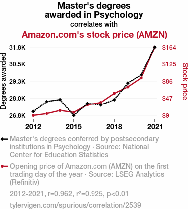 User prompt: Please make up a funny explanation for how an increase in Master's degrees awarded in Psychology caused Amazon.com's stock price (AMZN) to increase.