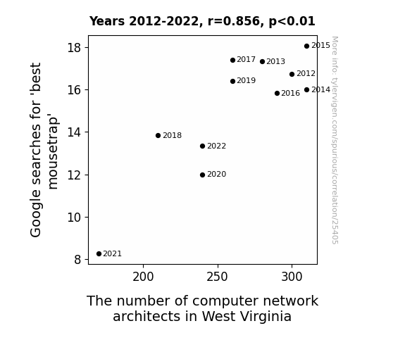 This means 73.4% of the change in the one variable (i.e., The number of computer network architects in West Virginia) is predictable based on the change in the other (i.e., Google searches for 'best mousetrap') over the 11 years from 2012 through 2022.