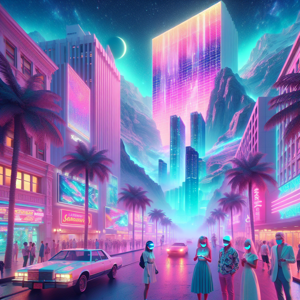 ChatGPT: Generate an image that encapsulates a surreal Vaporwave rendition of Vernal, Utah, with a futuristic feel. Imagine a cityscape with distorted pastel buildings and palm trees, surrounded by a hazy, ethereal glow. Amidst the chaos, tourists in retro-futuristic attire, wearing face masks, are seen wandering the neon-lit streets. In the background, a colossal billboard displays the vibrant stock price chart of América Móvil (AMX), casting a luminous glow over the city as the demand for their mobile services surges.