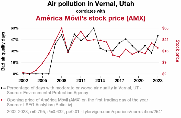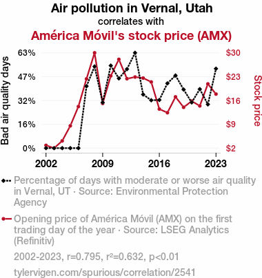 - The spurious research paper: Air We Go Again: The Atmospheric Influence on Stock Prices - A Case Study of Vernal, Utah's Air Pollution and América Móvil's (AMX) Stock Price