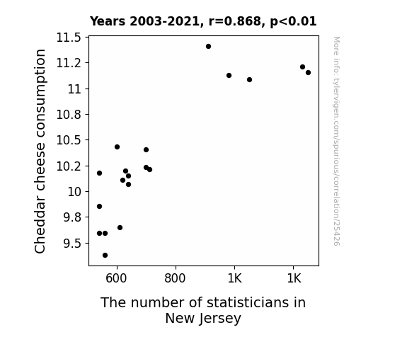 This means 75.4% of the change in the one variable (i.e., The number of statisticians in New Jersey) is predictable based on the change in the other (i.e., Cheddar cheese consumption) over the 19 years from 2003 through 2021.