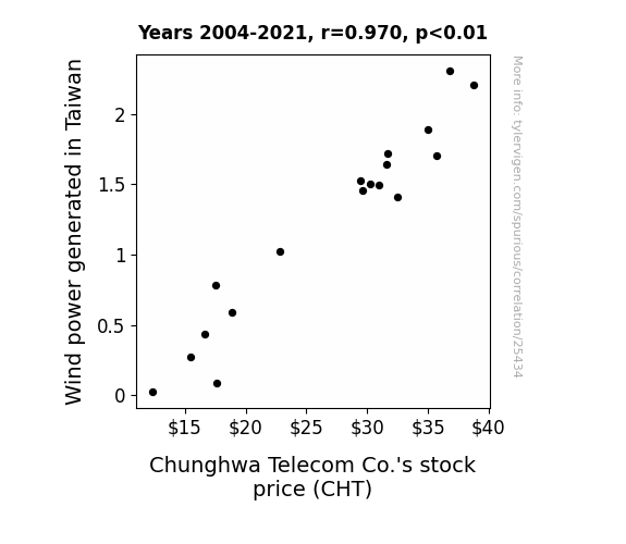 This means 94.1% of the change in the one variable (i.e., Chunghwa Telecom Co.'s stock price (CHT)) is predictable based on the change in the other (i.e., Wind power generated in Taiwan) over the 18 years from 2004 through 2021.