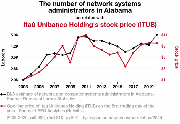 This means 81% of the change in the one variable (i.e., Itaú Unibanco Holding's stock price (ITUB)) is predictable based on the change in the other (i.e., The number of network systems administrators in Alabama) over the 18 years from 2003 through 2020.