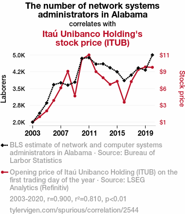 User prompt: Please provide potential search keywords for a paper titled A Small Mischievous Twinkle: The Link Between Network Systems Administrators in Alabama and Itaú Unibanco Holding's Stock Price with an abstract of This study delves into the enigmatic relationship between the number of network systems administrators in the heart of Alabama and the stock price of Itaú Unibanco Holding (ITUB). Using a careful analysis of data obtained from the Bureau of Labor Statistics and LSEG Analytics (Refinitiv), we aimed to uncover any faint whispers of a correlation between these seemingly disparate entities. Employing robust statistical methods, we unearthed a correlation coefficient of 0.8999055, with a remarkable p-value of less than 0.01 for the period spanning from 2003 to 2020. Our findings beguilingly tango at the intersection of number crunching and market shenanigans, shedding light on a peculiar dance between the working souls of Alabama and the rhythms of financial markets.