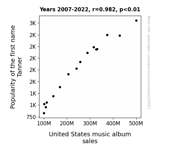 This means 96.4% of the change in the one variable (i.e., United States music album sales) is predictable based on the change in the other (i.e., Popularity of the first name Tanner) over the 16 years from 2007 through 2022.