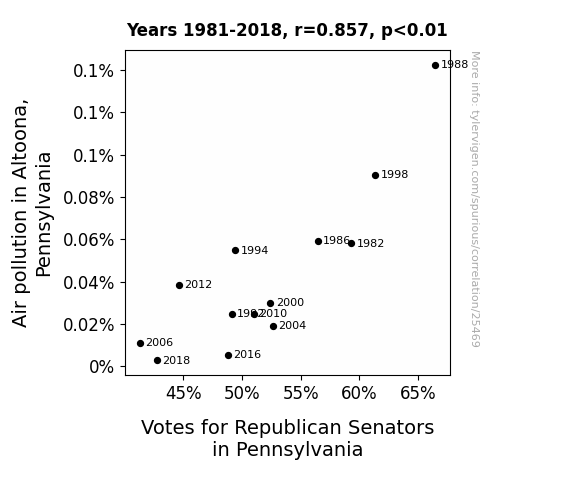 This means 73.4% of the change in the one variable (i.e., Votes for Republican Senators in Pennsylvania) is predictable based on the change in the other (i.e., Air pollution in Altoona, Pennsylvania) over the 13 years from 1981 through 2018.