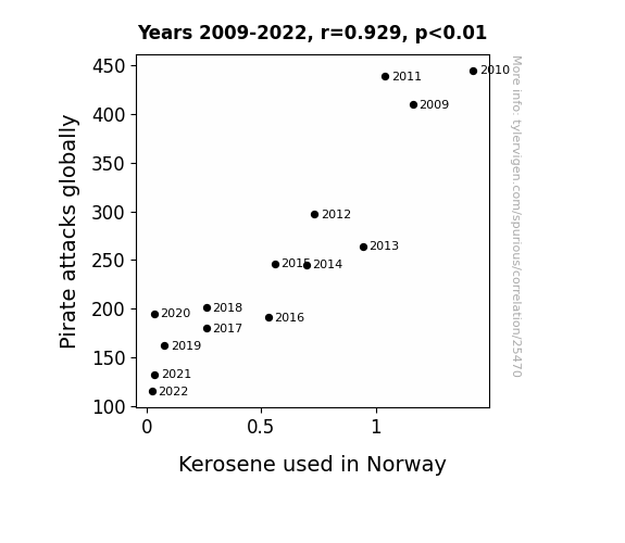 This means 86.3% of the change in the one variable (i.e., Kerosene used in Norway) is predictable based on the change in the other (i.e., Pirate attacks globally) over the 14 years from 2009 through 2022.