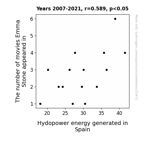 This means 34.7% of the change in the one variable (i.e., Hydopower energy generated in Spain) is predictable based on the change in the other (i.e., The number of movies Emma Stone appeared in) over the 15 years from 2007 through 2021.