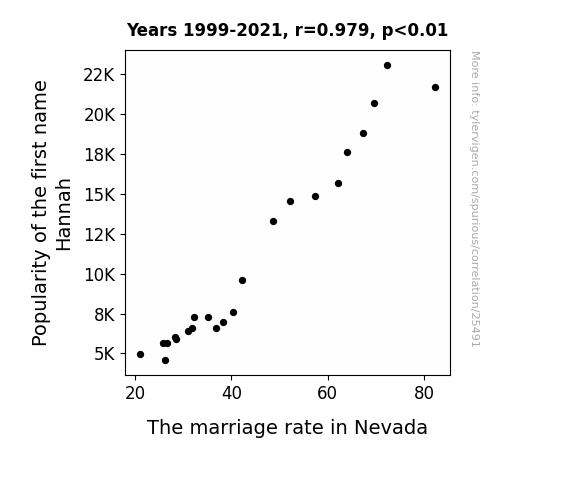 This means 95.8% of the change in the one variable (i.e., The marriage rate in Nevada) is predictable based on the change in the other (i.e., Popularity of the first name Hannah) over the 23 years from 1999 through 2021.