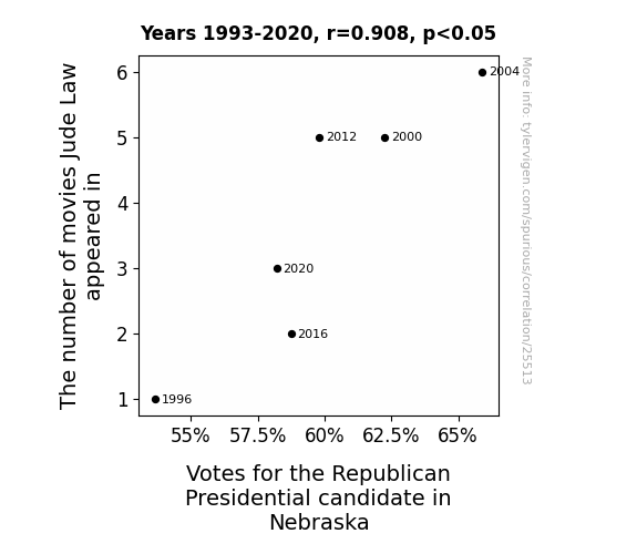 This means 82.4% of the change in the one variable (i.e., Votes for the Republican Presidential candidate in Nebraska) is predictable based on the change in the other (i.e., The number of movies Jude Law appeared in) over the 6 years from 1993 through 2020.