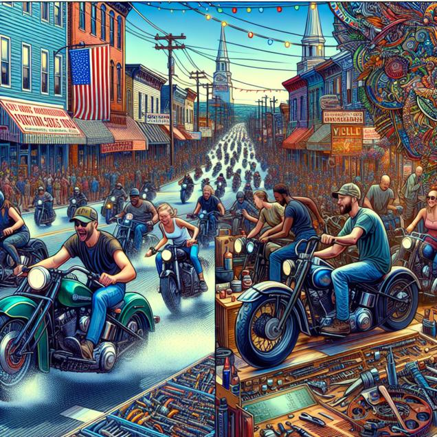 Prompt: Generate a captivating image of a TIME magazine cover featuring a vibrant scene in a bustling Maine town. Within the scene, there are numerous individuals named Sylvia joyfully zipping around on motorcycles, creating an energetic and lively atmosphere. Depict overflowing workstations with motorcycle mechanics busily tending to their tasks, encompassing the skyrocketing demand for their services. Capture the streets filled with the sound of engines and the omnipresent impact of the name Sylvia, symbolizing the unstoppable force she has become within the motorcycling community. Ensure that the visual representation is dynamic and resonates with the bustling energy of the town's motorcycling culture. The depiction should include only scenes, people, and objects, it should not include text or speech bubbles.