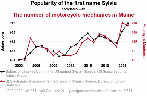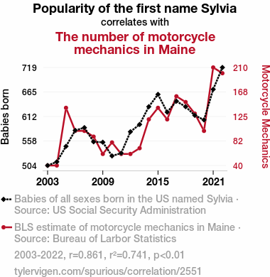 - The spurious research paper: Sylvia's Synergy: Unraveling the Revving Relationship between the Name Sylvia's Popularity and the Count of Motorcycle Mechanics in Maine