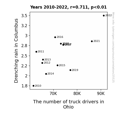 This means 50.5% of the change in the one variable (i.e., The number of truck drivers in Ohio) is predictable based on the change in the other (i.e., Drenching rain in Columbus) over the 13 years from 2010 through 2022.