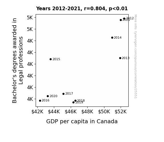 This means 64.7% of the change in the one variable (i.e., GDP per capita in Canada) is predictable based on the change in the other (i.e., Bachelor's degrees awarded in Legal professions) over the 10 years from 2012 through 2021.