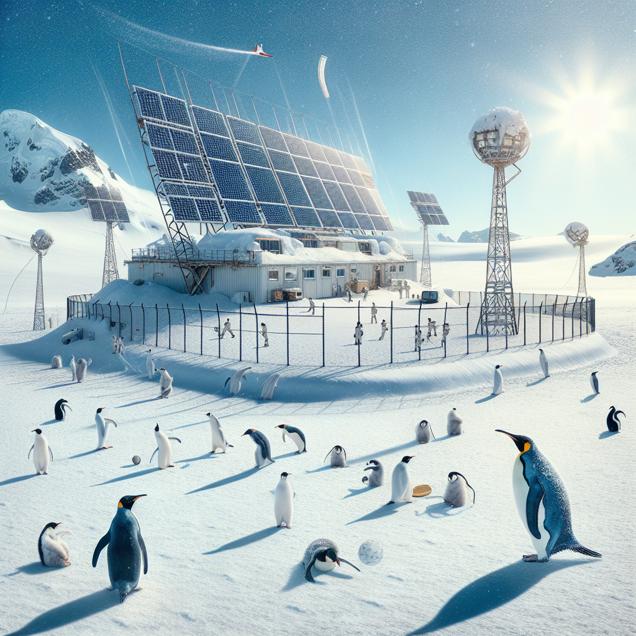 Prompt: [ a Polaroid photo ] of a remote Antarctic station surrounded by ice and snow. A group of penguins wander around the station, with solar panels seen nearby collecting energy from the sun. As the panels fluctuate with changing weather, the penguins' moods subtly shift. This causes a ripple effect on the Earth's magnetic field, subtly swaying it. In the distance, a baseball field appears, where the losing team in the World Series seems off-balance, struggling to score runs under the influence of the fluctuating magnetic field. The depiction should include only scenes, people, and objects, it should not include text or speech bubbles.