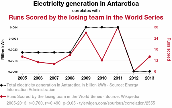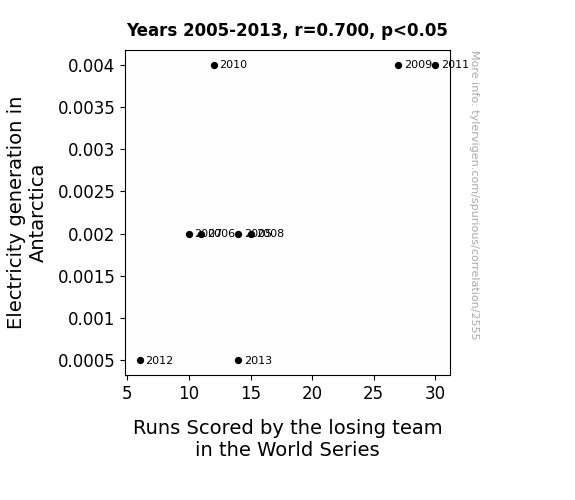 - The spurious research paper: Shocking Slugfest: An Electrifying Analysis of the Relationship Between Electricity Generation in Antarctica and Runs Scored by the Losing Team in the World Series