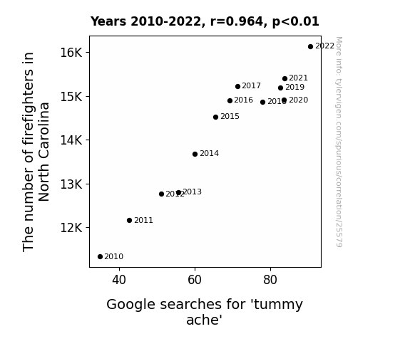 This means 92.9% of the change in the one variable (i.e., Google searches for 'tummy ache') is predictable based on the change in the other (i.e., The number of firefighters in North Carolina) over the 13 years from 2010 through 2022.