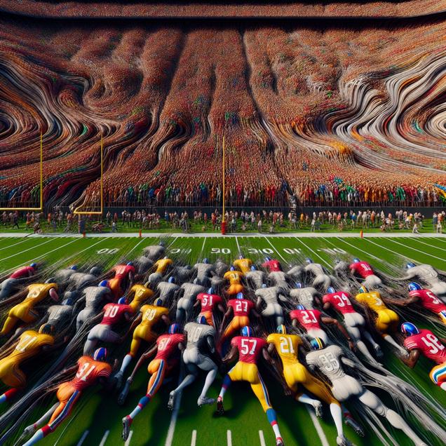 Prompt: [ Hyper-realistic ] Generate an image of a football stadium filled with cheering fans, the field containing the Denver Broncos' defensive players. Show the players visibly straining to maintain their formation as invisible gravitational forces, represented as distorted ripples in the air, create gaps in their defense around them. Depict the players in slow motion, with their movements appearing stretched and distorted, highlighting their struggle due to the distant influence of Mercury. The colors and textures should emphasize the hyper-realistic portrayal of the chaotic scene. The depiction should include only scenes, people, and objects, it should not include text or speech bubbles.
