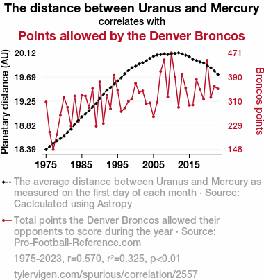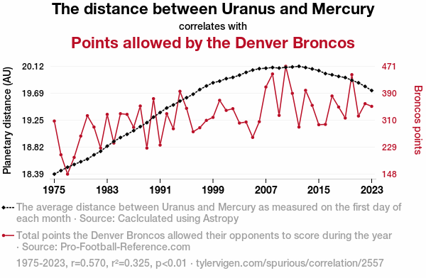 - The spurious research paper: Are the Denver Broncos Playing Defense... in the Solar System? A Correlational Analysis of the Distance between Uranus and Mercury and Points Allowed on the Football Field