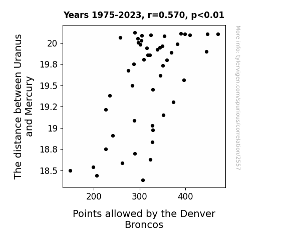 This means 32.5% of the change in the one variable (i.e., Points allowed by the Denver Broncos) is predictable based on the change in the other (i.e., The distance between Uranus and Mercury) over the 49 years from 1975 through 2023.
